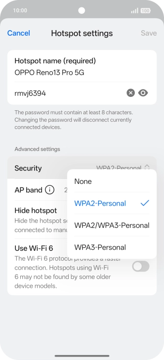 Press WPA3-Personal to password protect your Wi-Fi hotspot.