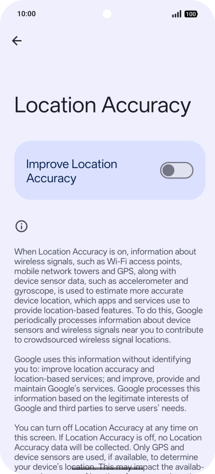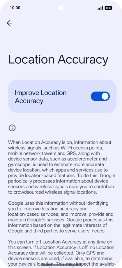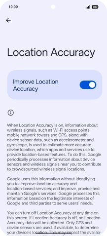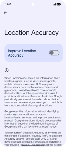 If you press the indicator next to "Improve Location Accuracy" to turn off the function, your phone can find your exact position using the GPS satellites but it may take longer as there is no access to supplementary information from the mobile network or nearby Wi-Fi networks.