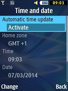 Scroll to Automatic time update and press the Navigation key to turn the function on or off.