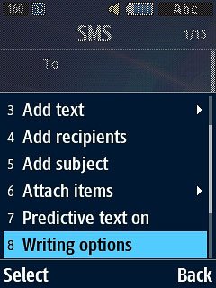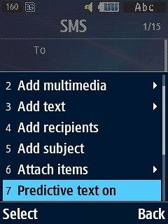 Highlight Predictive text on or Predictive text off and press the Navigation key to turn this function on or off.