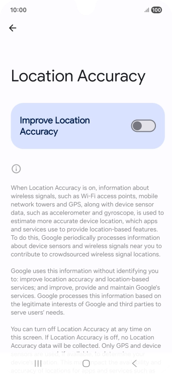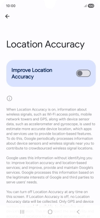 If you press the indicator next to "Improve Location Accuracy" to turn off the function, your phone can find your exact position using the GPS satellites but it may take longer as there is no access to supplementary information from the mobile network or nearby Wi-Fi networks.