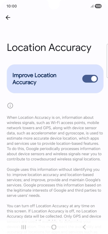 If you press the indicator next to "Improve Location Accuracy" to turn off the function, your phone can find your exact position using the GPS satellites but it may take longer as there is no access to supplementary information from the mobile network or nearby Wi-Fi networks.