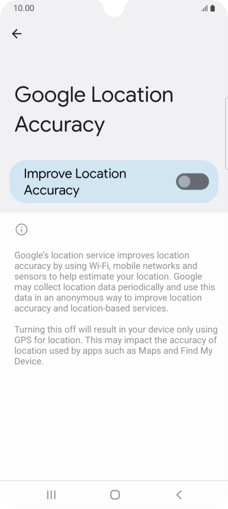 If you press the indicator next to "Improve Location Accuracy" to turn off the function, your phone can find your exact position using the GPS satellites but it may take longer as there is no access to supplementary information from the mobile network or nearby Wi-Fi networks.
