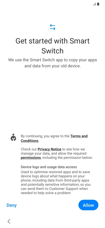 You can transfer the contents of another phone to your phone when it's activated for the first time and after a factory reset. When this screen is displayed, your phone is ready to transfer contents from another phone.