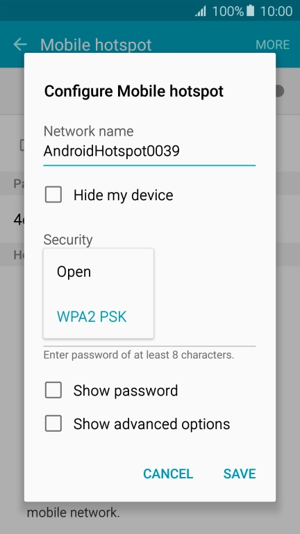 Press WPA2 PSK to password protect your Wi-Fi hotspot.