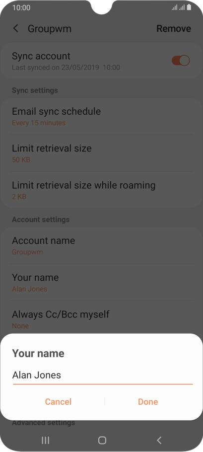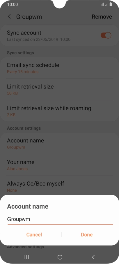 Key in the required name for the email account and press Done.