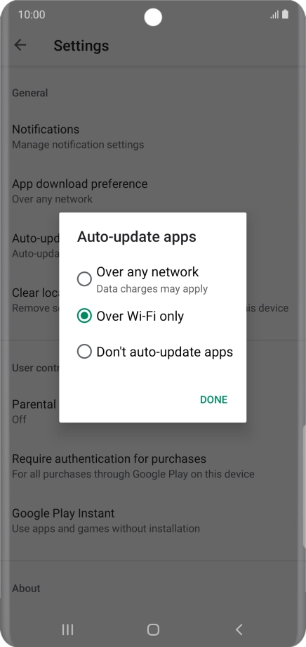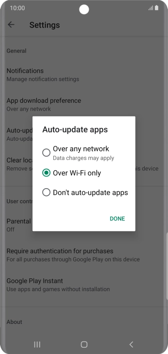 To turn on automatic update of apps using Wi-Fi, press Over Wi-Fi only.