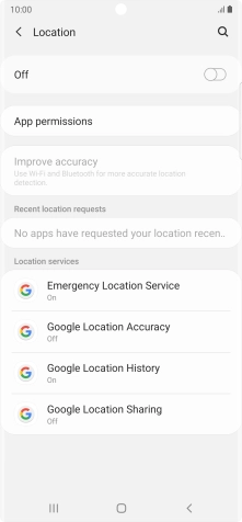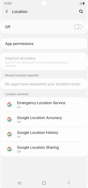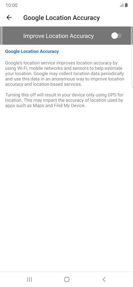 Press the indicator next to "Improve Location Accuracy" to turn off the function. If you turn off the function, your phone can find your exact position using the GPS satellites but it may take longer as there is no access to supplementary information from the mobile network or nearby Wi-Fi networks.