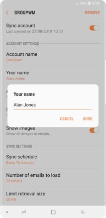 Key in the required name for the email account and press DONE.