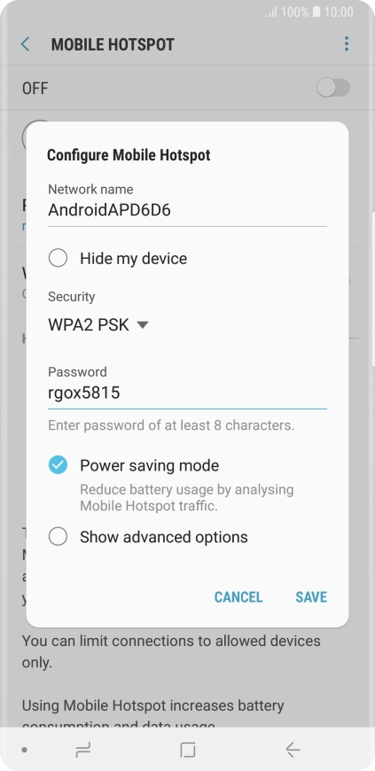 Press WPA2 PSK to password protect your Wi-Fi hotspot.