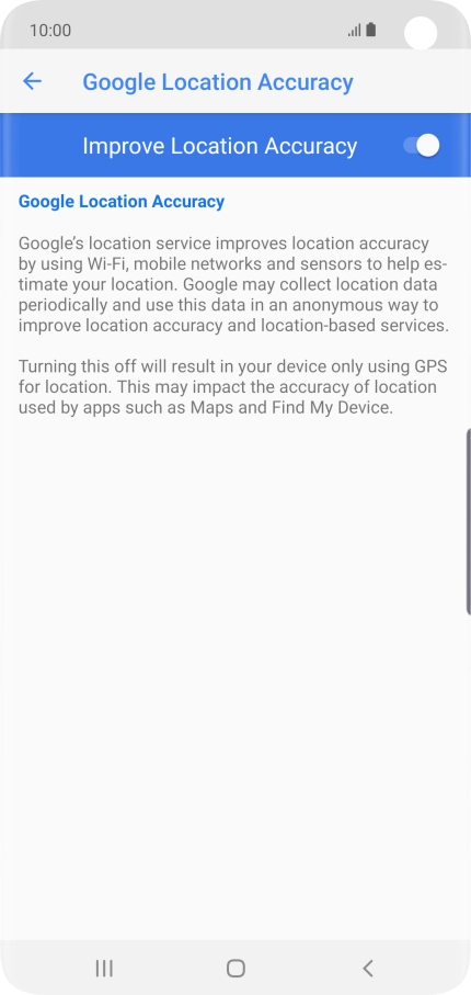 If you press the indicator next to "Improve Location Accuracy" to turn off the function, your phone can find your exact position using the GPS satellites but it may take longer as there is no access to supplementary information from the mobile network or nearby Wi-Fi networks.