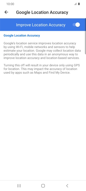 If you press the indicator next to "Improve Location Accuracy" to turn off the function, your phone can find your exact position using the GPS satellites but it may take longer as there is no access to supplementary information from the mobile network or nearby Wi-Fi networks.