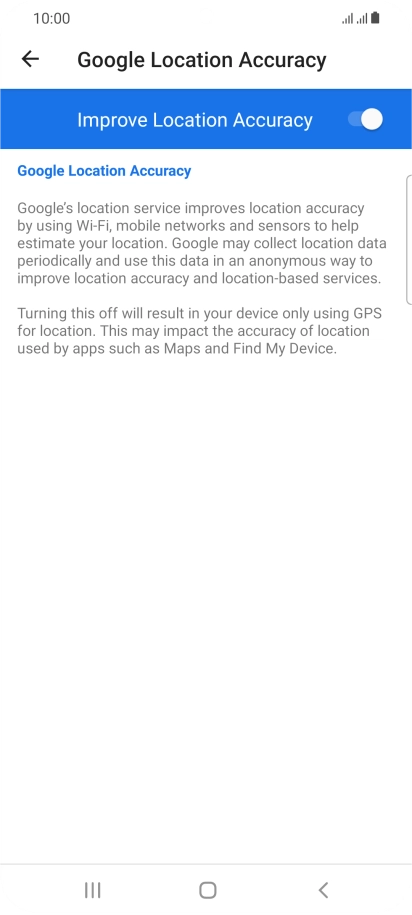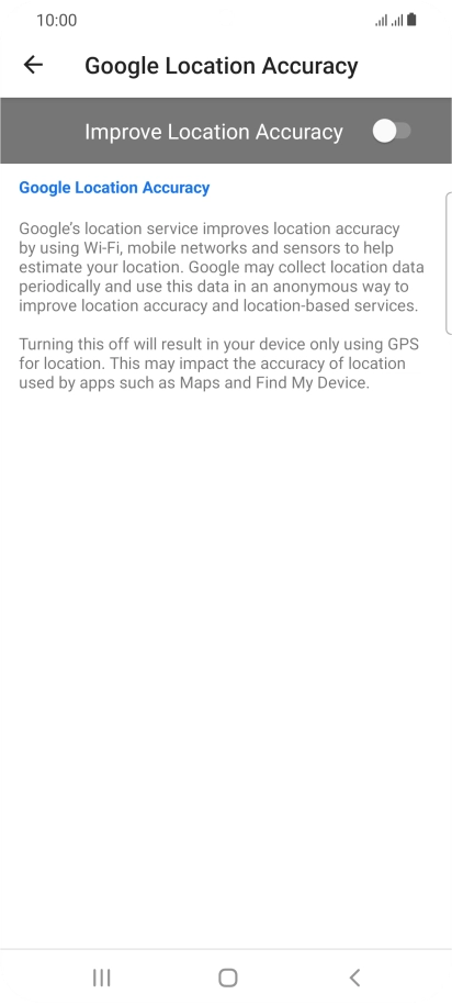 If you press the indicator next to "Improve Location Accuracy" to turn off the function, your phone can find your exact position using the GPS satellites but it may take longer as there is no access to supplementary information from the mobile network or nearby Wi-Fi networks.
