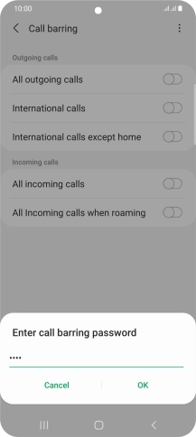 Key in your barring password and press OK. The default barring password is 0000.