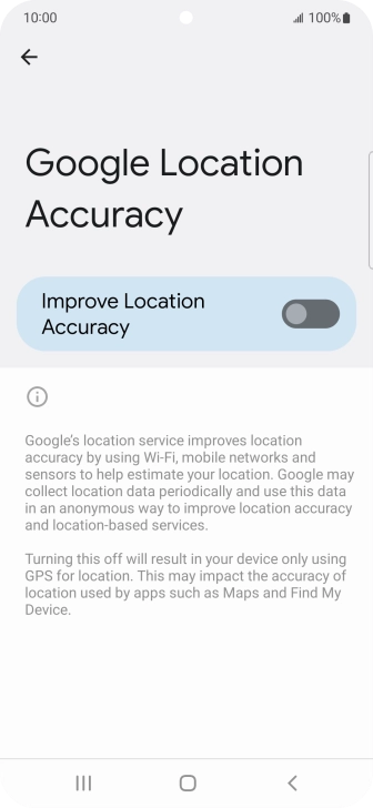 If you press the indicator next to "Improve Location Accuracy" to turn off the function, your phone can find your exact position using the GPS satellites but it may take longer as there is no access to supplementary information from the mobile network or nearby Wi-Fi networks.