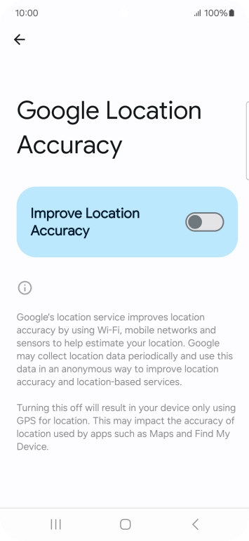 If you press the indicator next to "Improve Location Accuracy" to turn off the function, your phone can find your exact position using the GPS satellites but it may take longer as there is no access to supplementary information from the mobile network or nearby Wi-Fi networks.