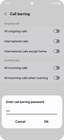 Key in your barring password and press OK. The default barring password is 0000.