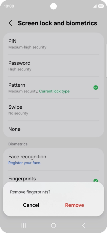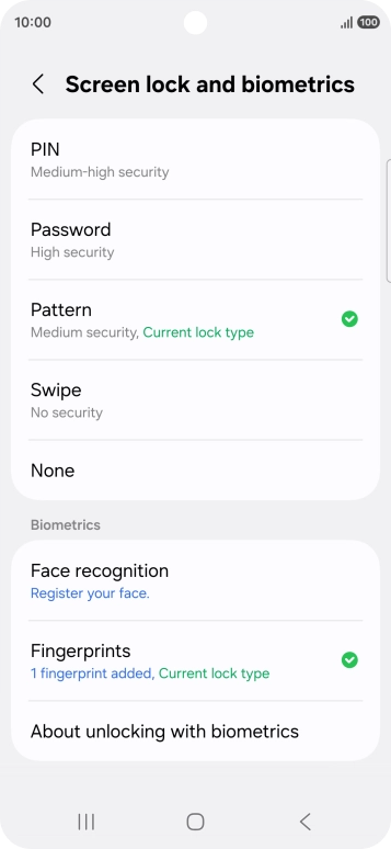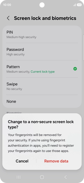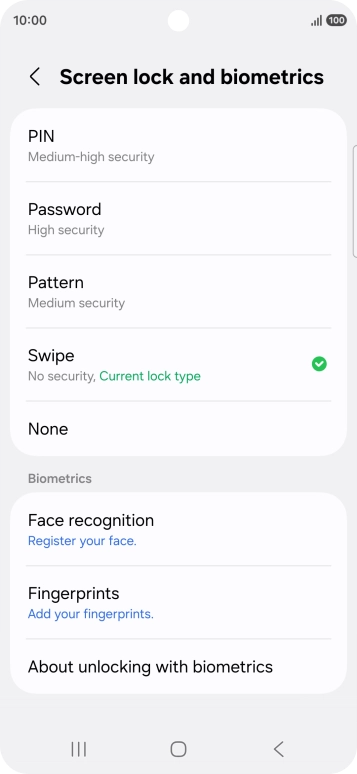 Press Screen lock and biometrics and key in the additional phone lock code you created earlier.