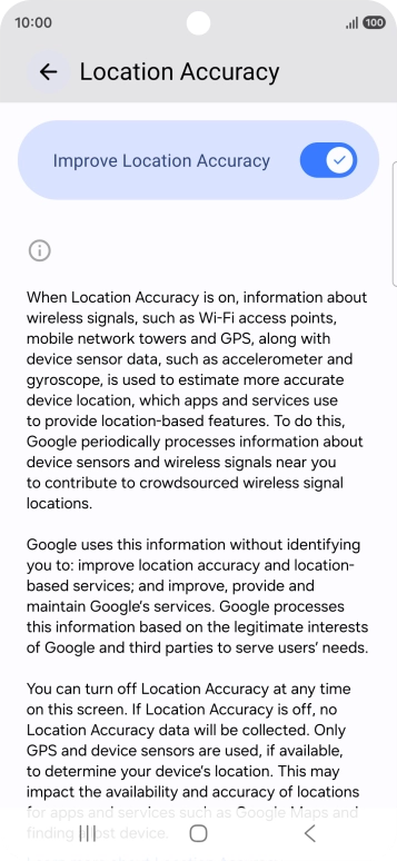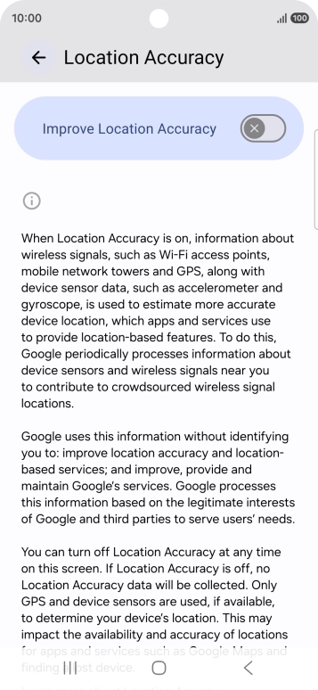 If you press the indicator next to "Improve Location Accuracy" to turn off the function, your phone can find your exact position using the GPS satellites but it may take longer as there is no access to supplementary information from the mobile network or nearby Wi-Fi networks.