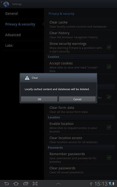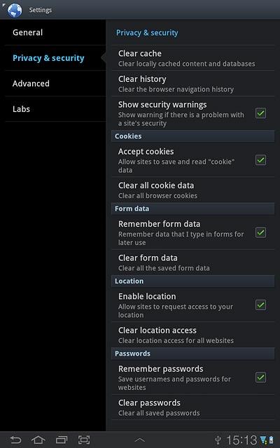 When you use your device's internet browser, various data is stored temporarily in the browser memory, such as cache and cookies. If you have problems loading web pages, deleting this data may help. Follow these instructions to clear browser data.