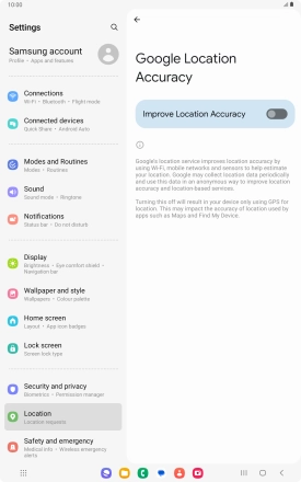 If you press the indicator next to "Improve Location Accuracy" to turn off the function, your tablet can find your exact position using the GPS satellites but it may take longer as there is no access to supplementary information from the mobile network or nearby Wi-Fi networks.