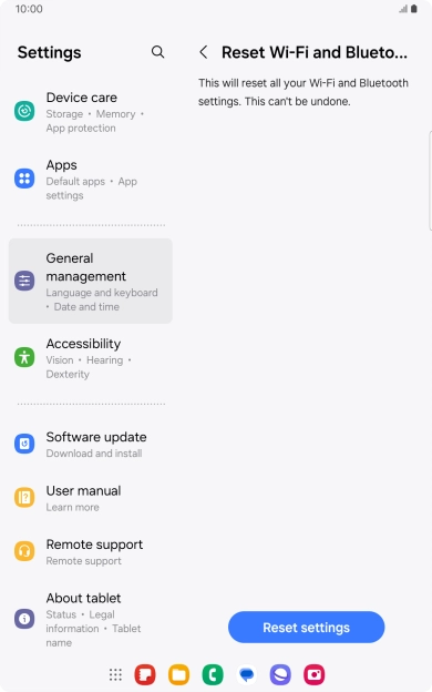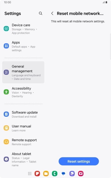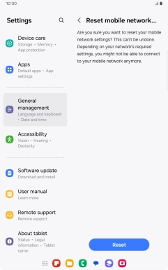 If you have problems using network configurations on your tablet, such as mobile data, Wi-Fi or Bluetooth, resetting the network settings may help.