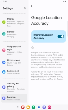 If you press the indicator next to "Improve Location Accuracy" to turn off the function, your tablet can find your exact position using the GPS satellites but it may take longer as there is no access to supplementary information from the mobile network or nearby Wi-Fi networks.