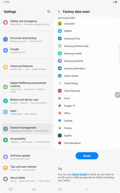 Press Delete all. Wait a moment while the factory default settings are restored. Follow the instructions on the screen to set up your tablet and prepare it for use.