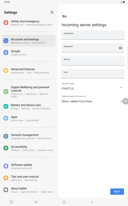 Press Never to keep email messages on the server when you delete them on your tablet.