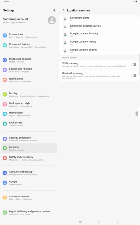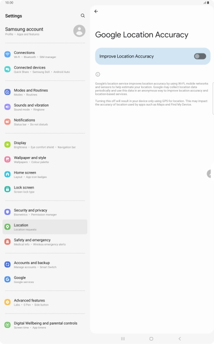 If you press the indicator next to "Improve Location Accuracy" to turn off the function, your tablet can find your exact position using the GPS satellites but it may take longer as there is no access to supplementary information from the mobile network or nearby Wi-Fi networks.