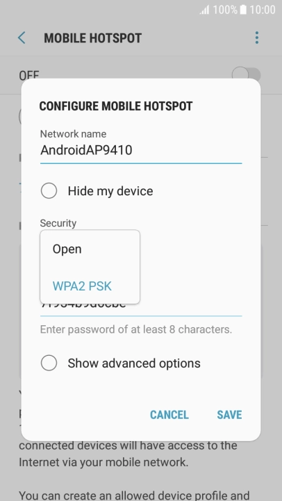 Press WPA2 PSK to password protect your Wi-Fi hotspot.