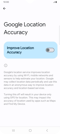 If you press the indicator next to "Improve Location Accuracy" to turn off the function, your phone can find your exact position using the GPS satellites but it may take longer as there is no access to supplementary information from the mobile network or nearby Wi-Fi networks.