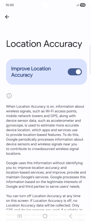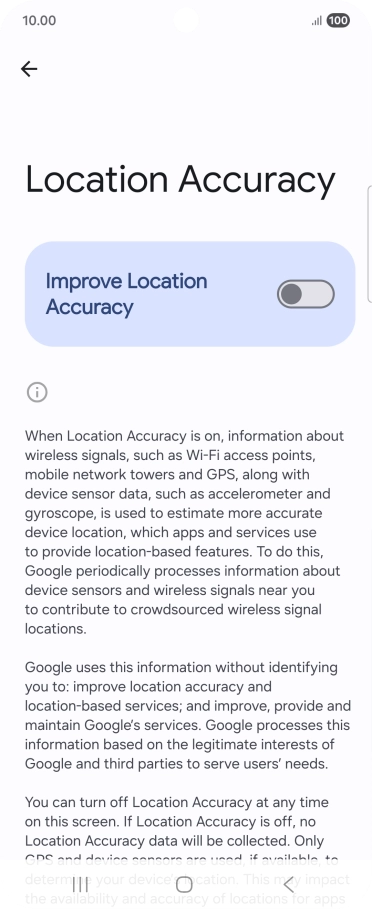 If you press the indicator next to "Improve Location Accuracy" to turn off the function, your phone can find your exact position using the GPS satellites but it may take longer as there is no access to supplementary information from the mobile network or nearby Wi-Fi networks.