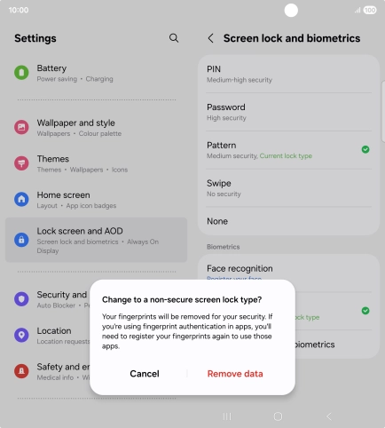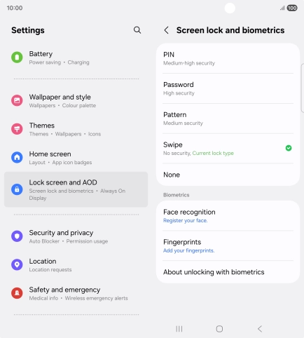 Press Screen lock and biometrics and key in the additional phone lock code you created earlier.