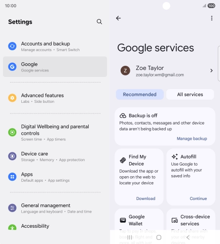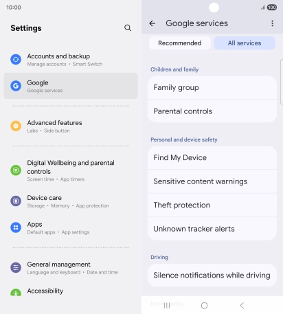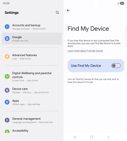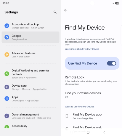 Select settings for Find My Device